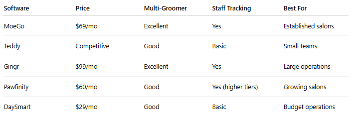 Salons with 3+ groomers who need comprehensive tools and can absorb premium pricing.