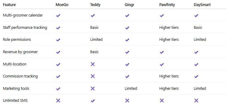 Teddy handles multi-groomer scheduling without enterprise complexity. Perfect for small salons (2–5 groomers) that want effective management without feature overload.