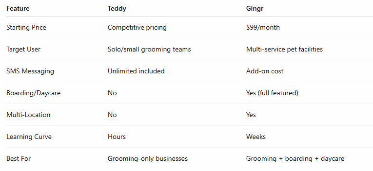 Teddy is built for independent groomers who want simple, affordable software with unlimited messaging. Gingr is enterprise-grade software designed for full-service pet care facilities offering grooming, boarding, and daycare.