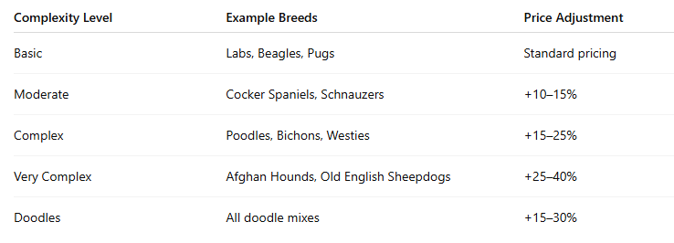 A 60-lb Lab might take 45 minutes, while a 20-lb heavily coated Pomeranian might take 90 minutes. Adjust pricing based on time and effort—not just size.