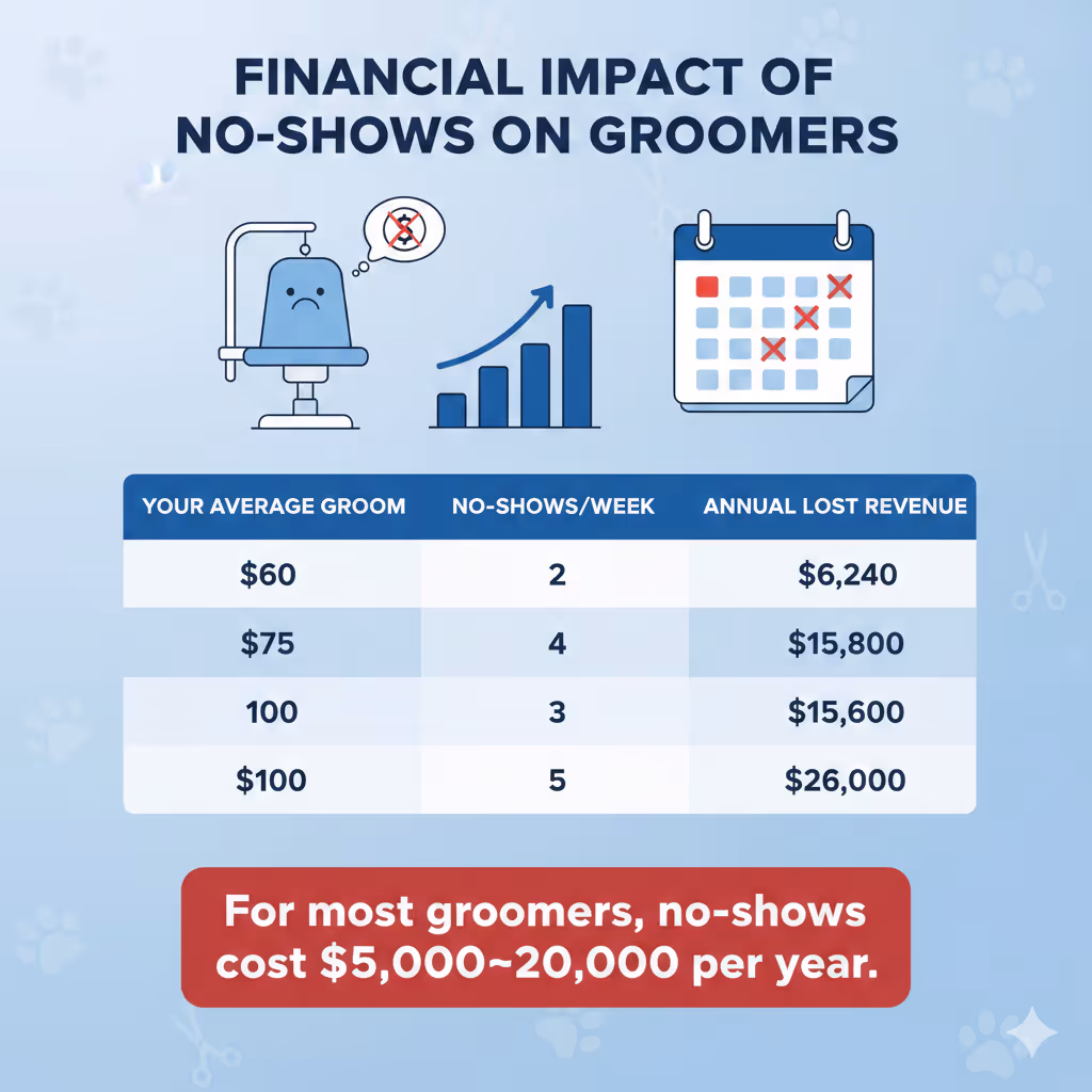 Every empty appointment slot costs you money. No-shows and last-minute cancellations don't just waste your time — they represent lost revenue that's nearly impossible to recover. For a busy groomer, no-shows can mean losing thousands of dollars annually.