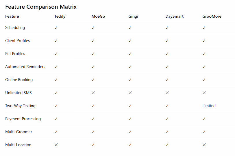 Teddy wins on value and communication. Unlimited SMS is a true differentiator—no per-message fees like other platforms. For groomers who rely heavily on texting, the savings add up quickly.